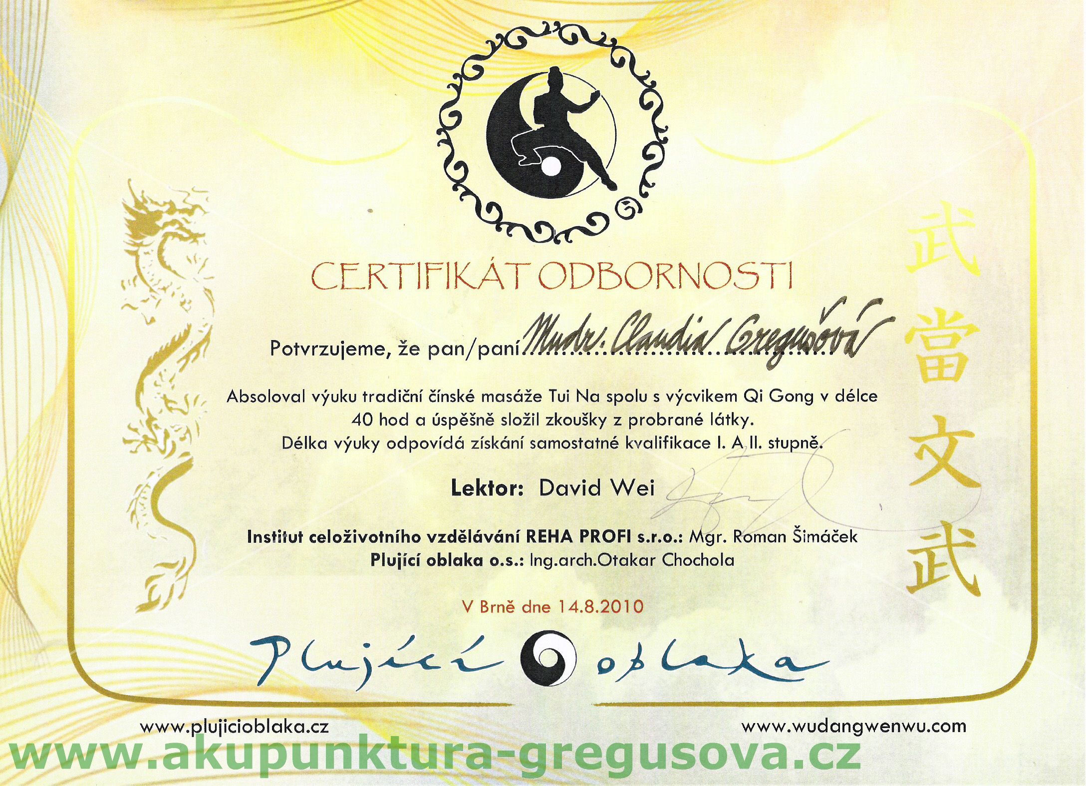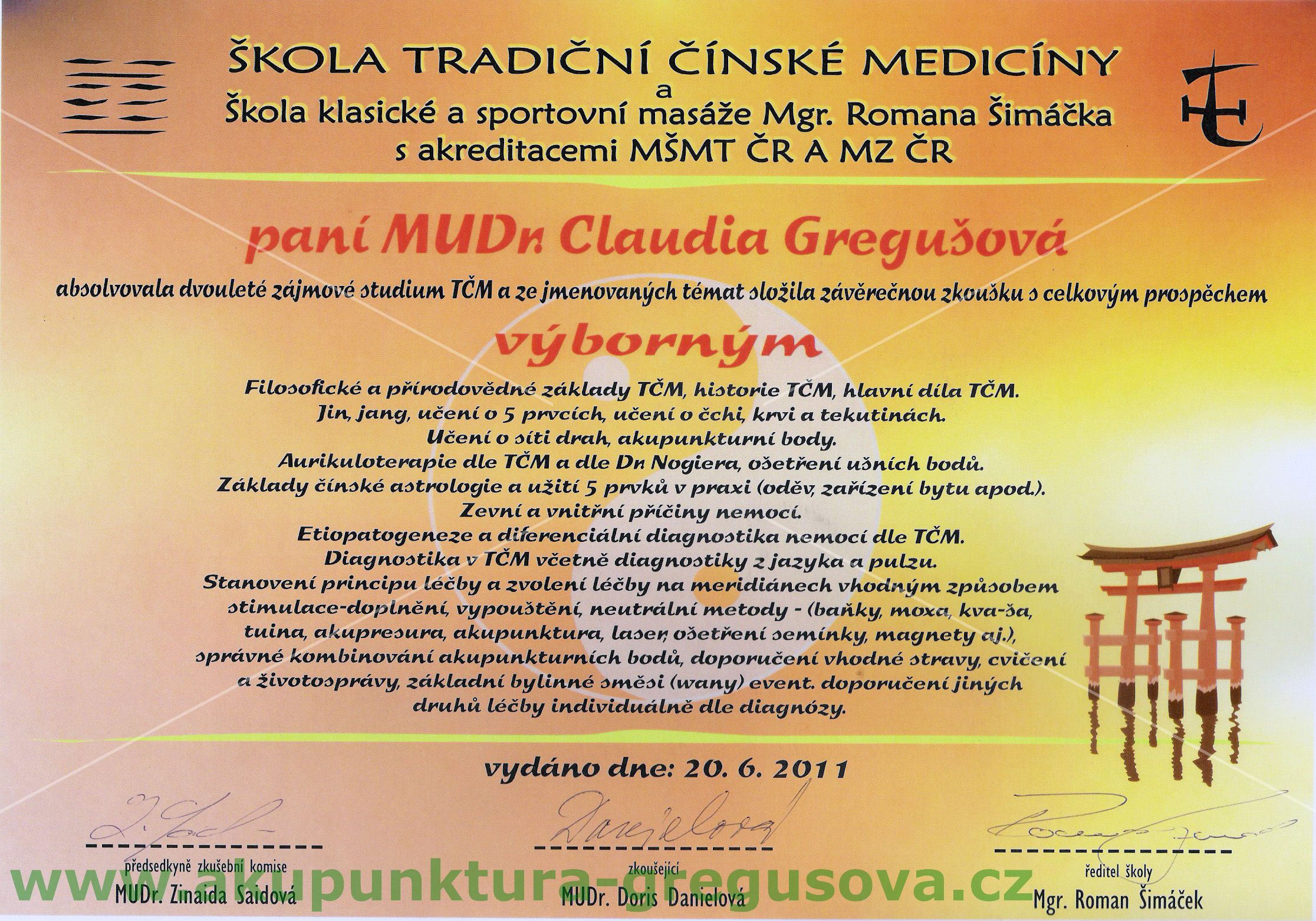 Dvouleté studium tradiční čínské medicíny, ukončené závěrečnou zkouškou a získáním certifikátu. |