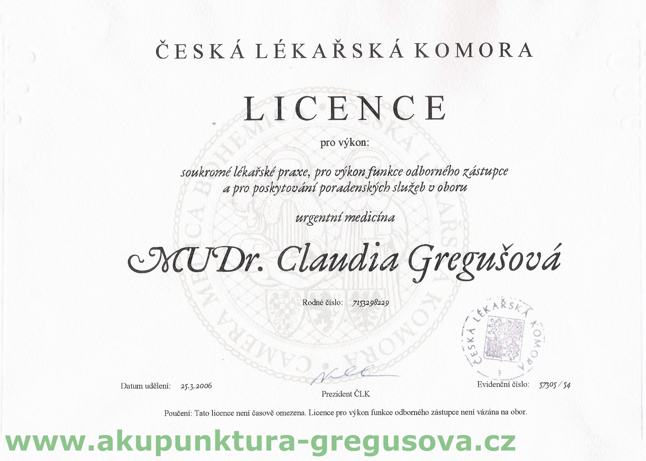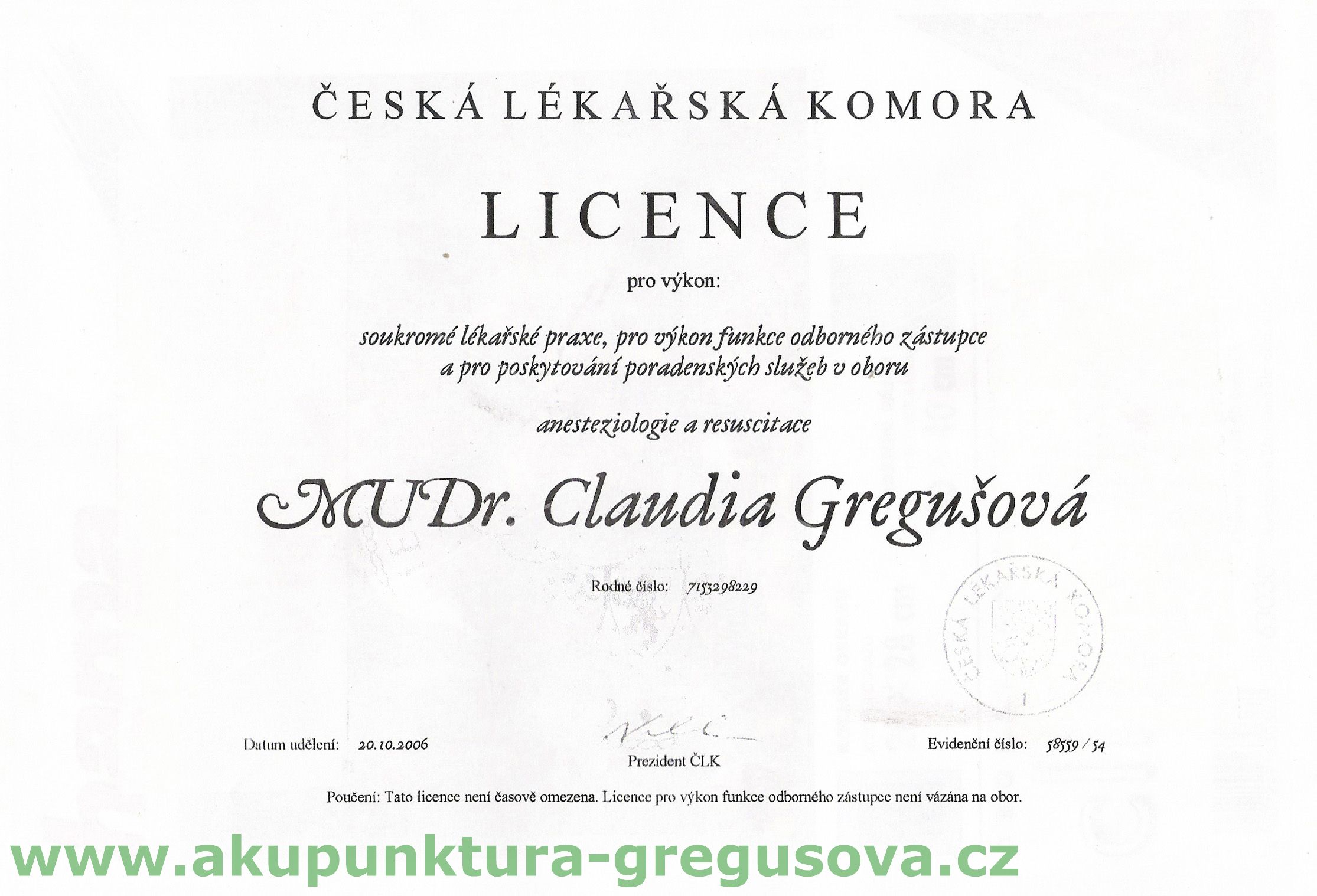 Licence ČLK pro výkon lékařské praxe, odborného zástupce a poskytování poradenských služeb v oborech anestezie, resuscitace a urgentní medicíny |