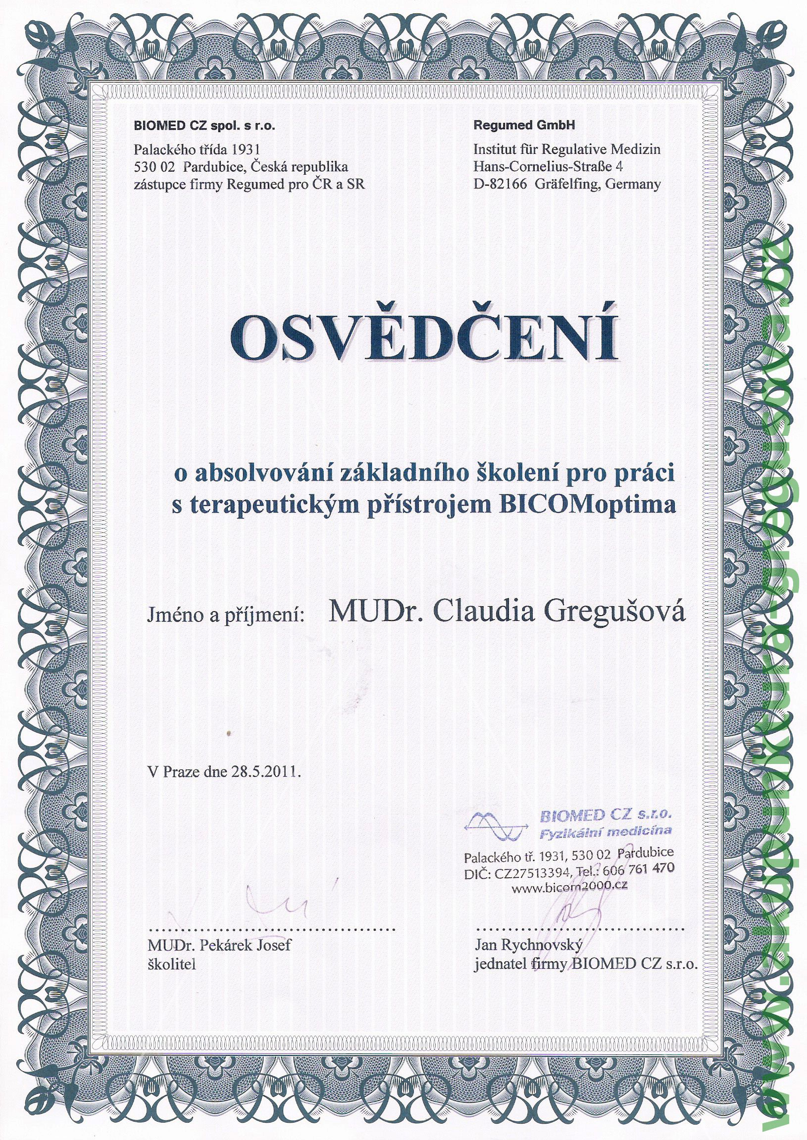Certifikát zoušky prvního stupně řízené a kontrolované detoxikace podle MUDr. Jonáše |