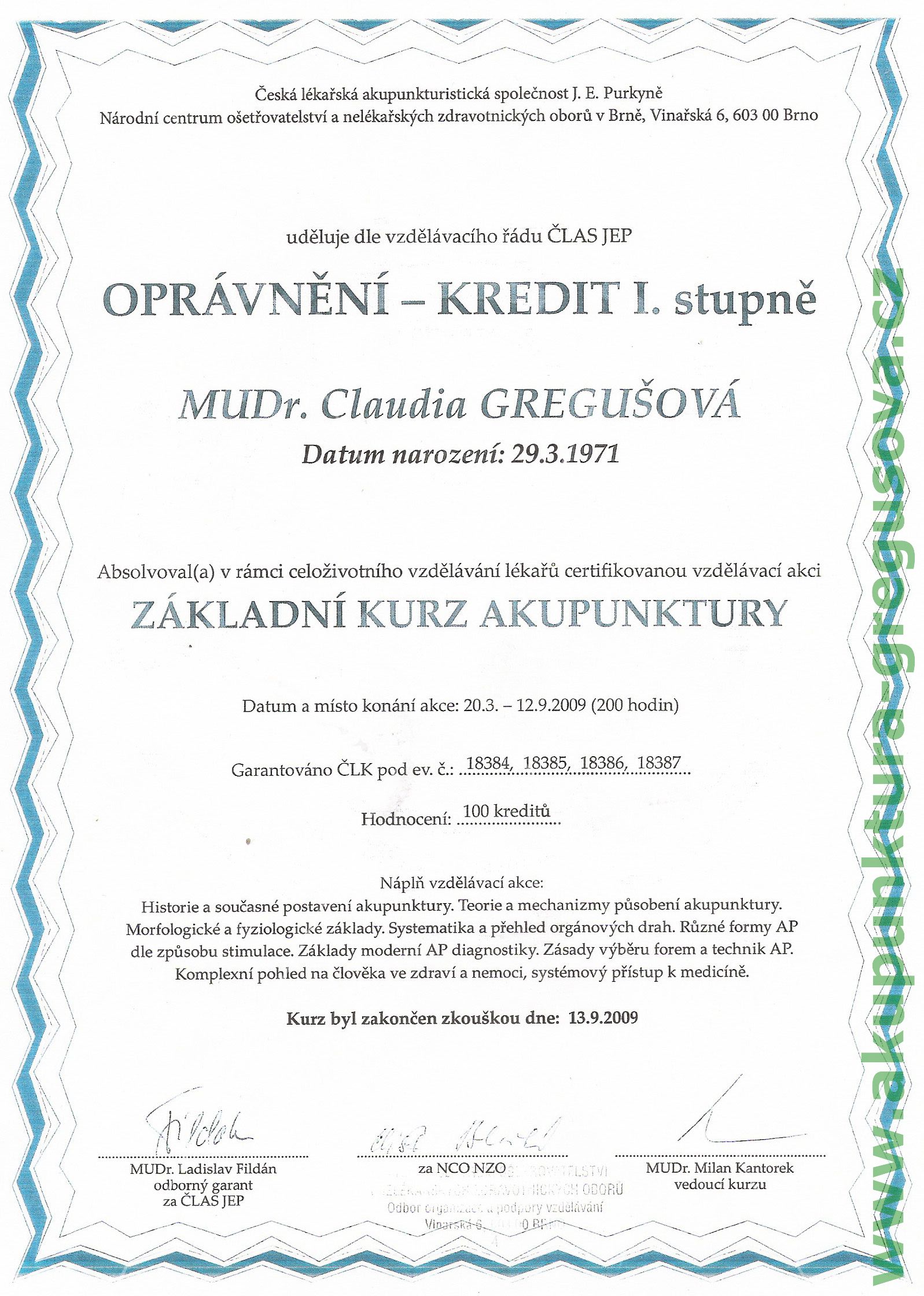 Základní kurz akupunktury, oprávnění k výkonu akupunktury – kredit I. Stupně |